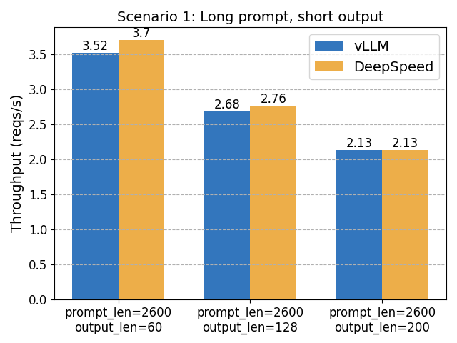 As a result, DeepSpeed-FastGen outperforms when the workload is consistently long prompt and short output. In other scenarios, vLLM shows superior performance.